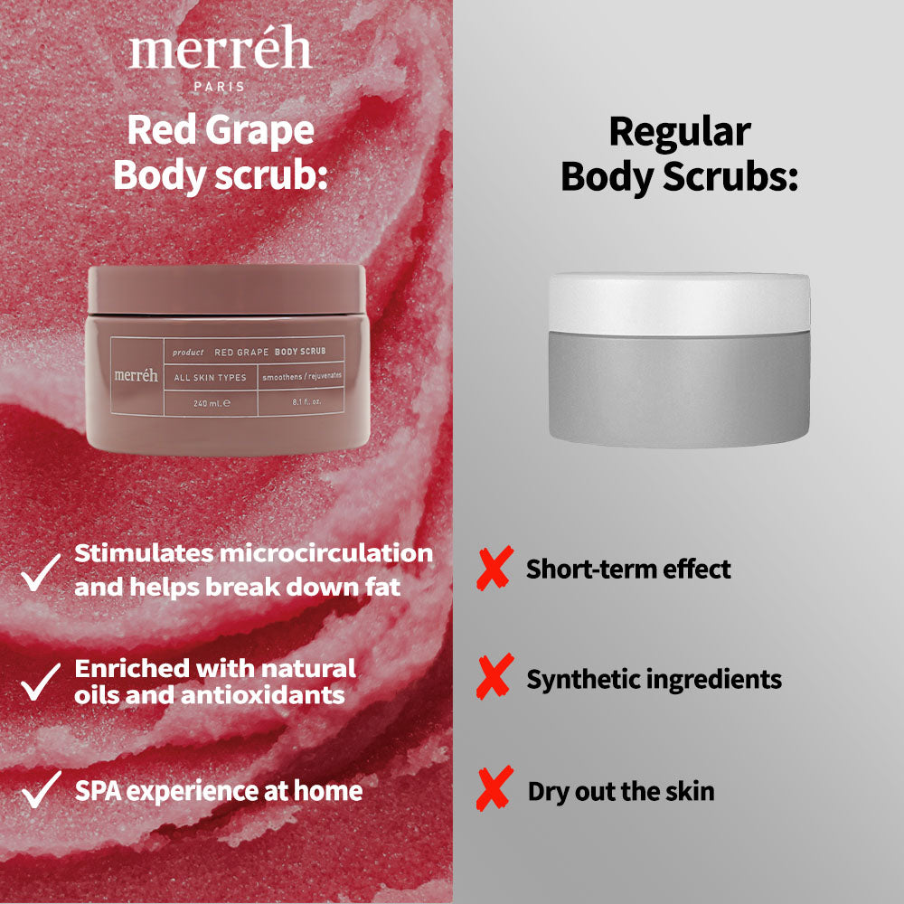 Treat yourself to smooth and deeply hydrated skin with Mérreh Red Grape Body Scrub.