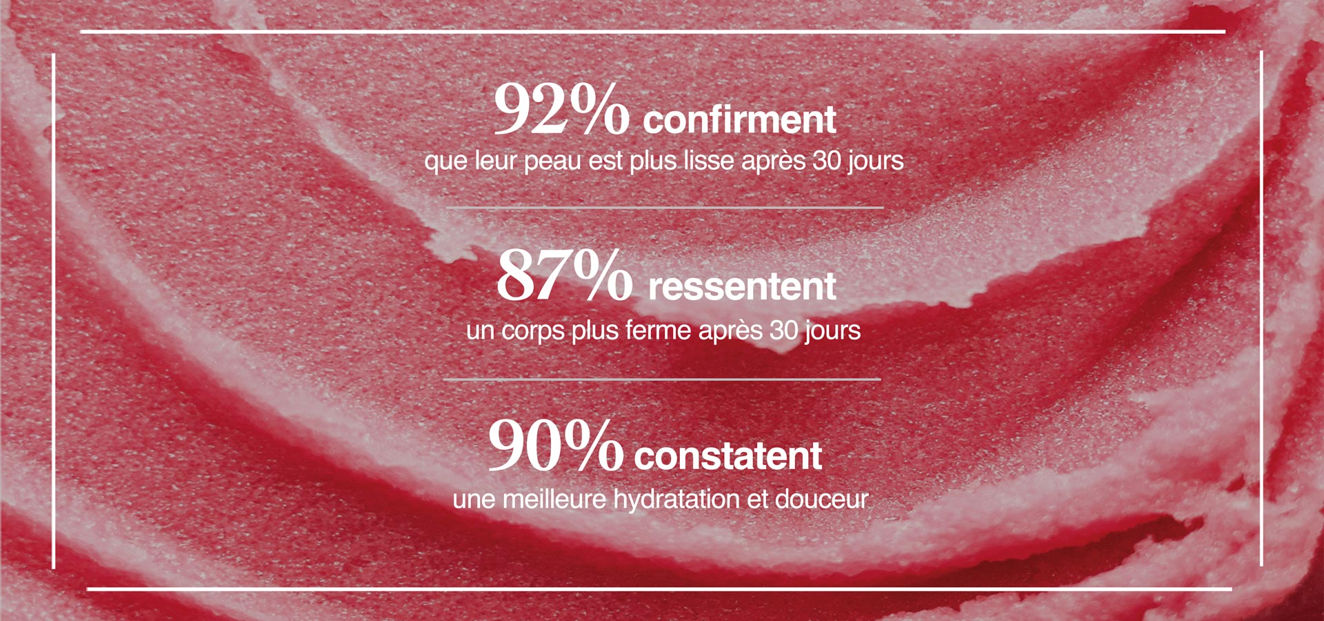 Après le gommage, rincez à l'eau, puis appliquez la Mousse Douche Détox et Éclat RAISIN ROUGE pour une peau douce et soyeuse. Enfin, appliquez le Lait Corps RAISIN ROUGE pour une hydratation intense.